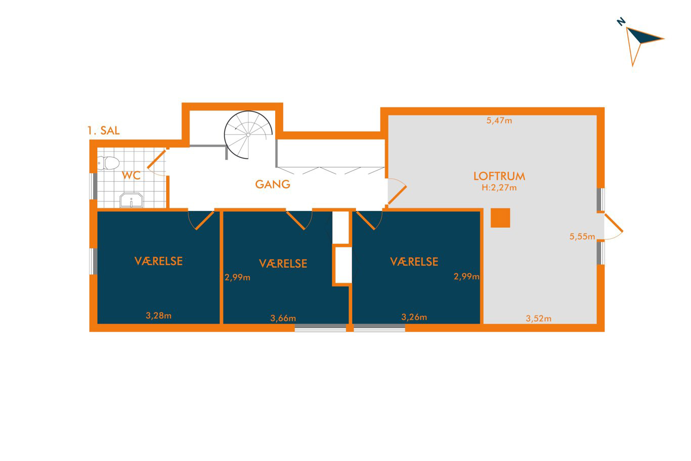 Das Erdgeschoss umfasst eine Eingangshalle mit Wendeltreppe, eine Küche mit Essbereich und Stauraum sowie ein Wohn- und Esszimmer. Ergänzend stehen ein Hauswirtschaftsraum, zwei weitere Zimmer und ein Badezimmer zur Verfügung. Im Obergeschoss befinden sich drei Zimmer, ein Gäste-WC sowie ein ausgebauter Dachboden mit Abstellmöglichkeiten.