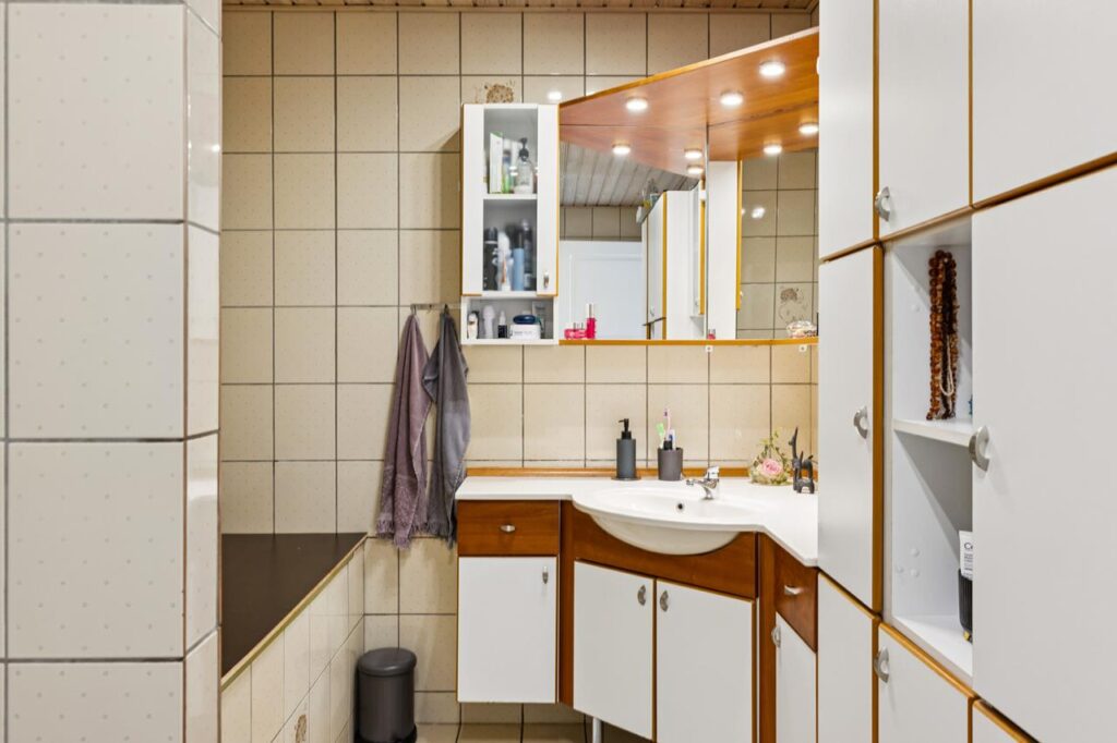 Das Haus betreten Sie über die Eingangshalle, von der aus ein geräumiger Hauswirtschaftsraum sowie ein großer Wohnraum, die Wohnküche, zu erreichen sind. Die Wohnküche bietet Zugang zu einer überdachten Terrasse. Im Erdgeschoss befinden sich zwei Schlafzimmer mit Einbauschränken und ein Badezimmer mit Badewanne und Dusche. Das Dachstudio bietet ein helles und freundliches Wohnambiente, daran angeschlossen ein weiterer Terrassenbereich mit ausreichend Platz zum sitzen. Die ursprüngliche Raumaufteilung in diesem Bereich, zwei separate Zimmer, kann bei Bedarf wiederhergestellt werden.