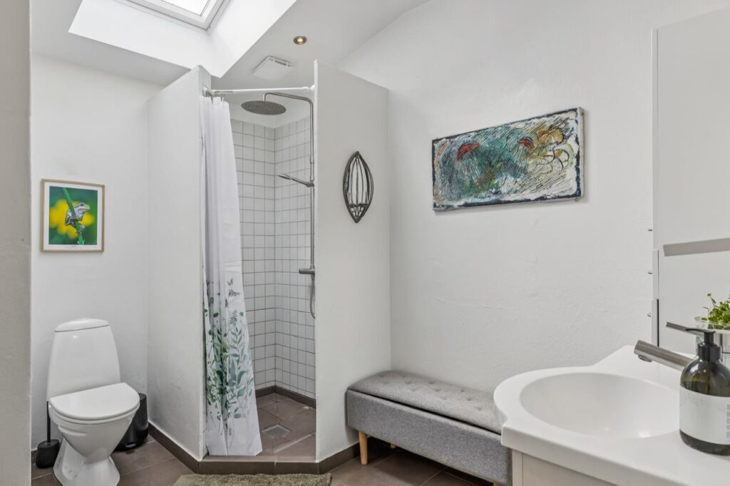 Gästehaus: Das 100 Quadratmeter große Gästehaus bietet eine ähnliche Raumaufteilung mit hohen Decken und hellen Räumen. Es umfasst einen Flur, einen Mehrzweckraum, ein Badezimmer mit Fußbodenheizung, ein Schlafzimmer und ein Wohnzimmer mit offener Küche. Das Gästehaus wird derzeit über Airbnb vermietet, eignet sich jedoch auch für verschiedene andere Nutzungen.